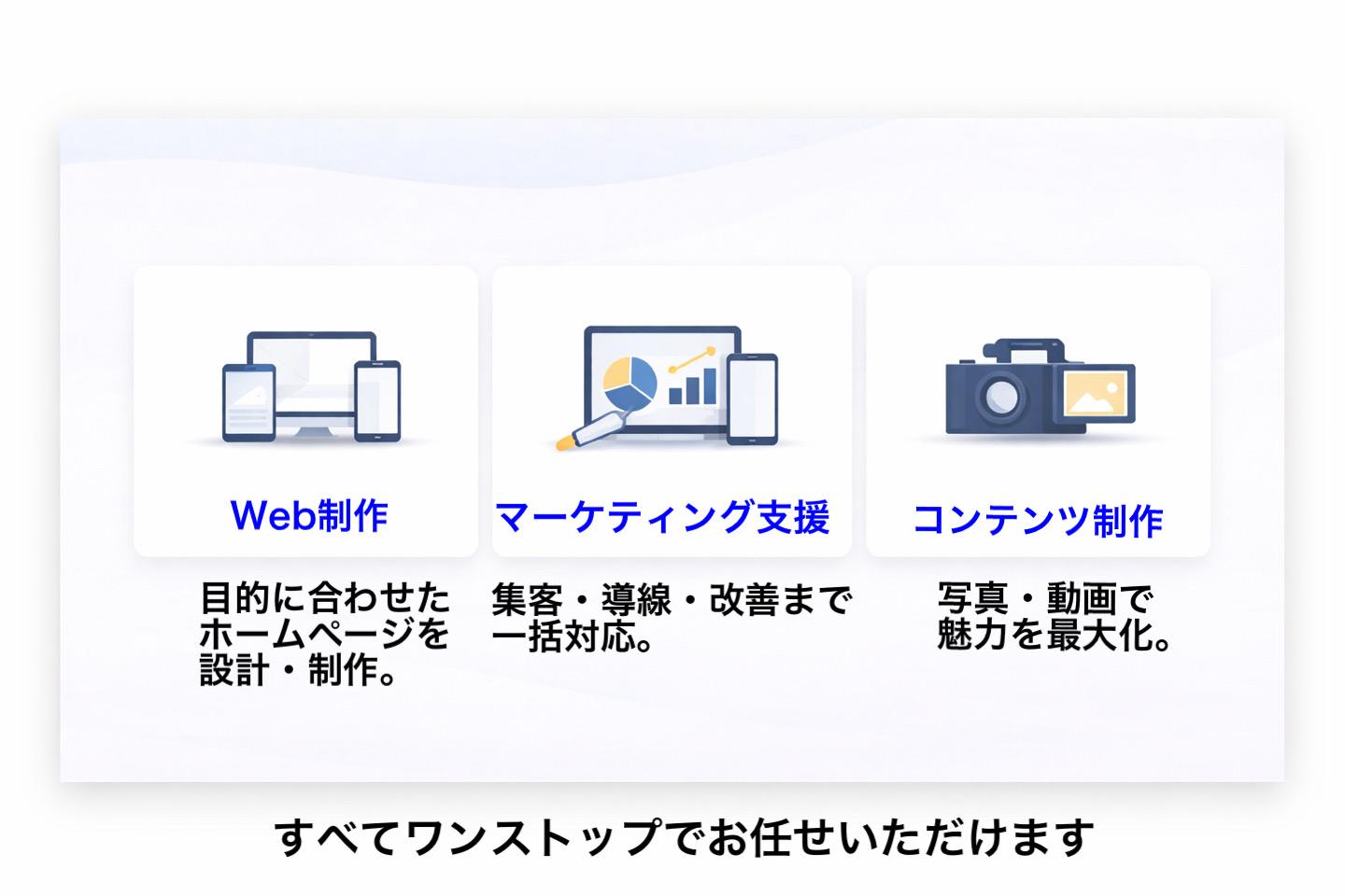 選ばれる理由「何をどう見せればいいか分からない」「作っただけで終わっている」そんな悩みを抱える企業・店舗様に対し、成果に繋がる“設計”からサポートします。制作だけで終わらず、集客・導線・見せ方まで一貫対応。だからこそ、「結果に繋がるホームページ」が実現できます。